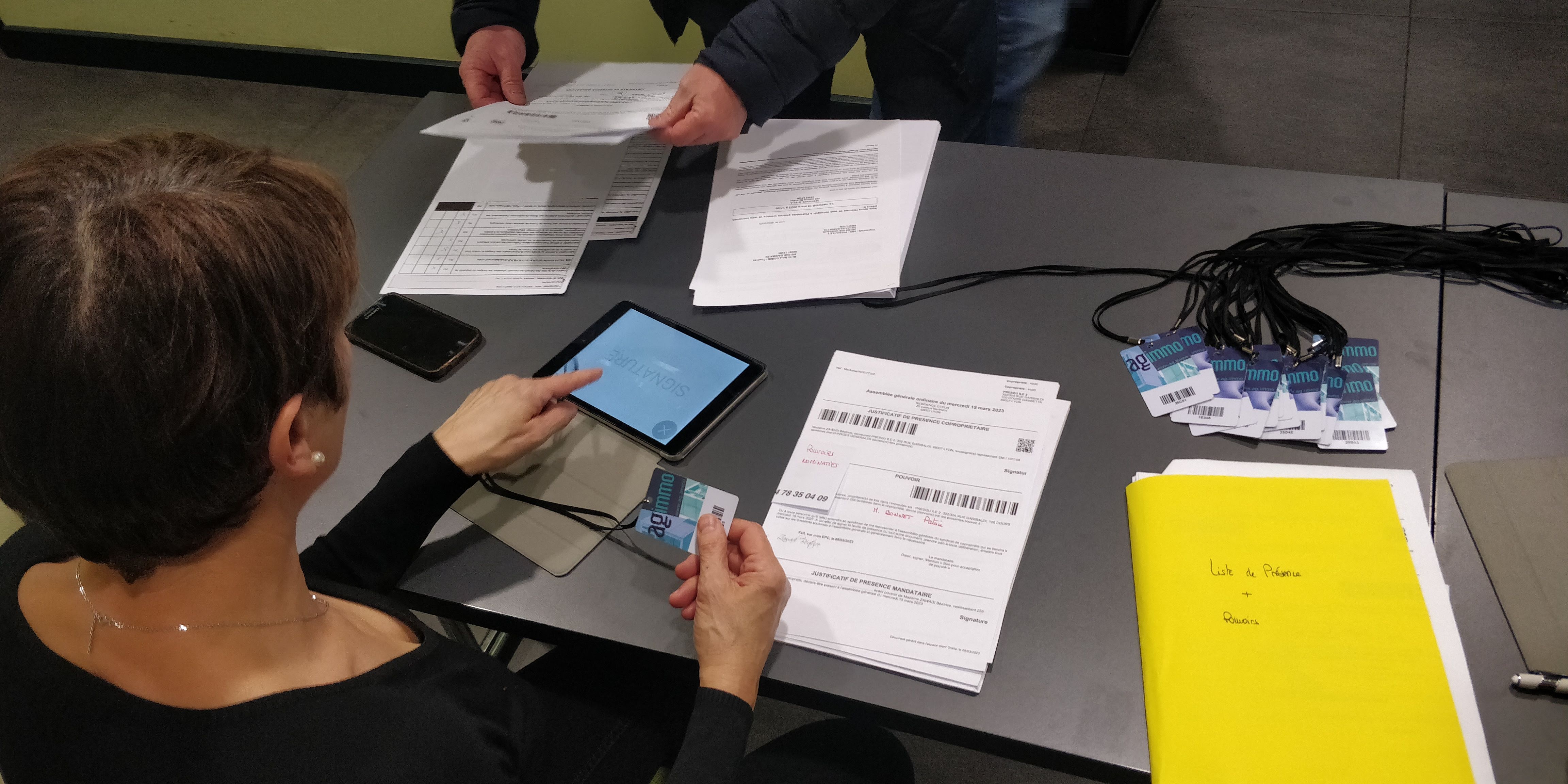 Hier, s' est tenue l'assemblée générale de l'une de notre plus grosse copropriété de près de 400 lots. La réunion a été très paisible, conviviale et dans la bonne humeur grâce à un conseil syndical très impliqué et à la participation de la société AGIMMO qui gère les votes avec des tablettes libérant ainsi le syndic de cette pression qui peut ainsi mener les débats, tenir son AG, expliquer les résolutions et répondre aux questions des copropriétaires.